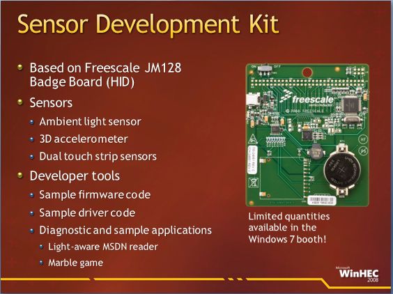 เพิ่งรู้ว่า Windows 7 มีของเล่นใหม่ ตามชื่อข้างบนเลย ออกชุดพัฒนา driver และ sdk ที่รองรับการเชื่อมต่อและอ่านข้อมูลจาก sensors ต่างๆ อย่างในชุดคิตที่เอามาเปิดตัวนี่ก็เป็นของ Freescale บอร์ดประกอบไปด้วย sensors ต่างๆดังนี้